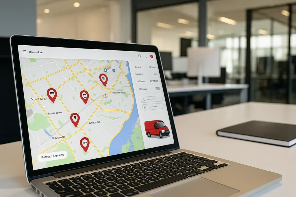 Permite visualizar a localização exata do veículo no mapa, com status do motor (ligado ou desligado), velocidade em tempo real, endereço detalhado e diversas outras informações operacionais.